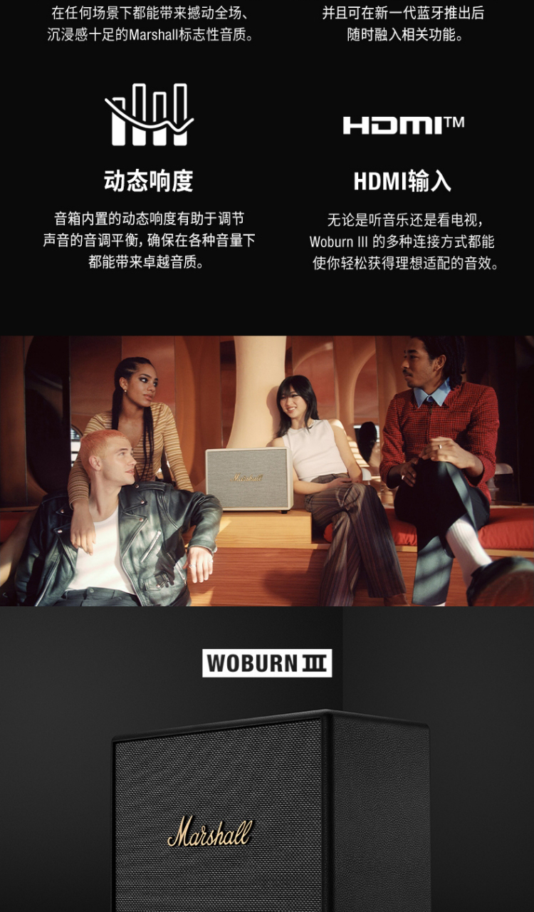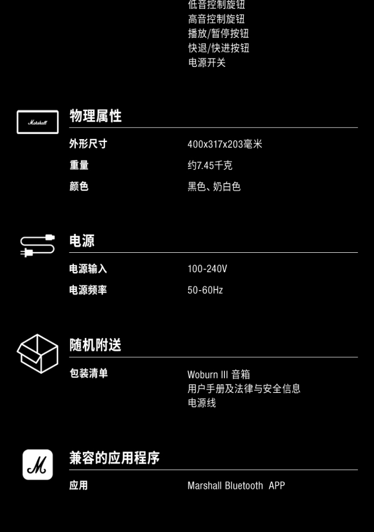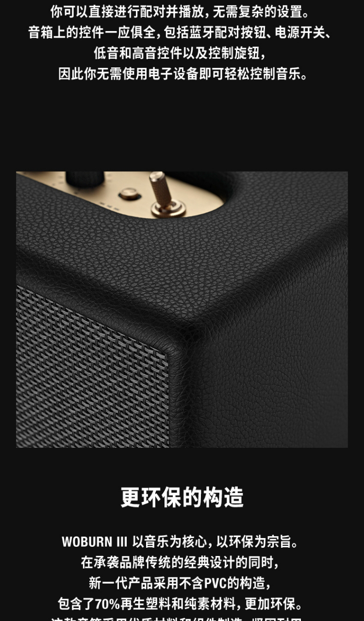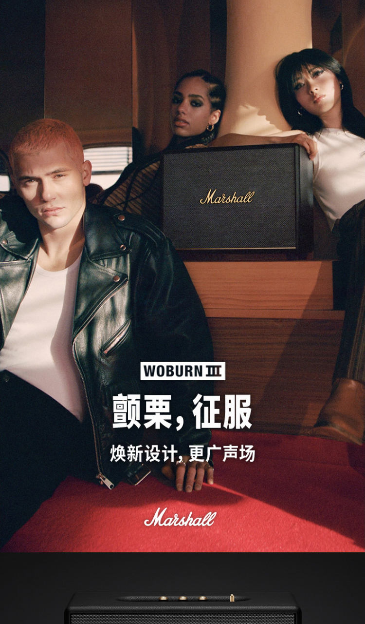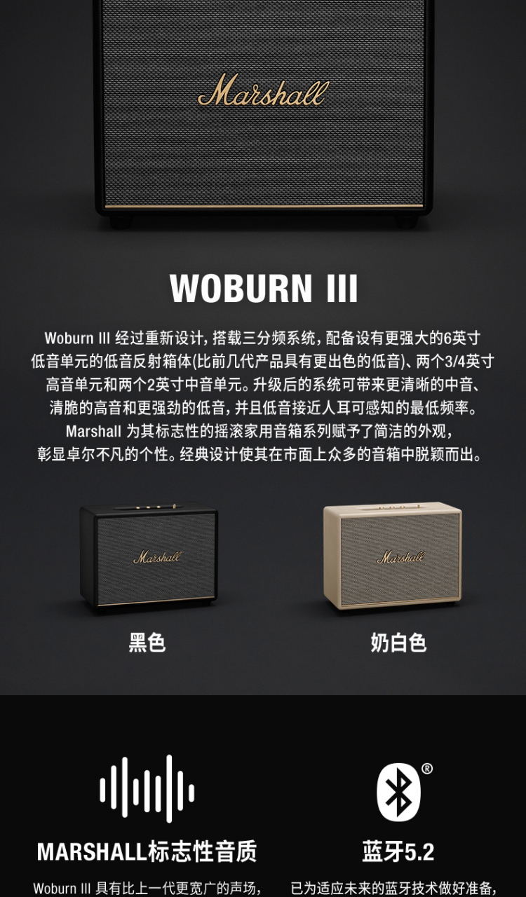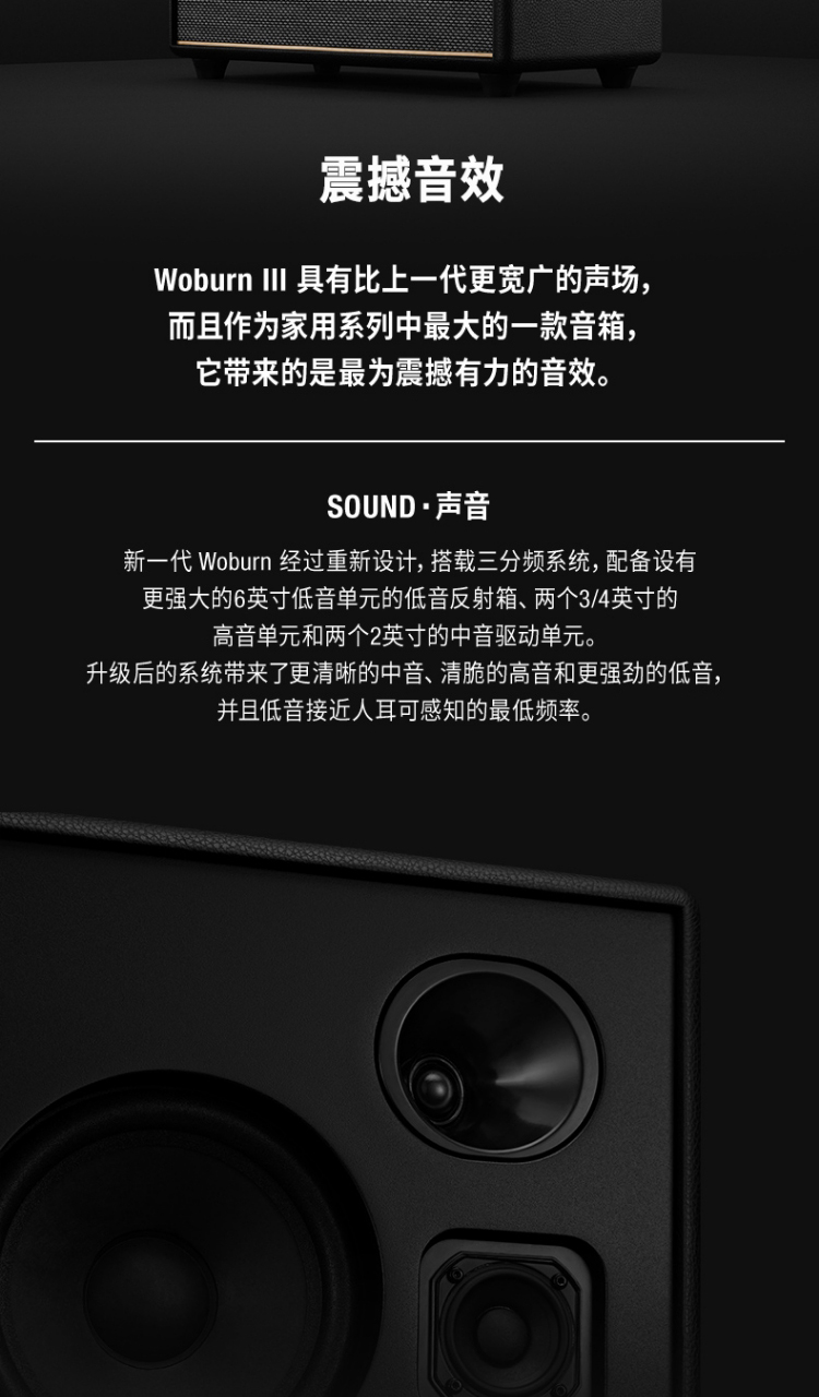 马歇尔(Marshall)WOBURN III 3代无线蓝牙音箱 摇滚家用重低音音响(黑色)